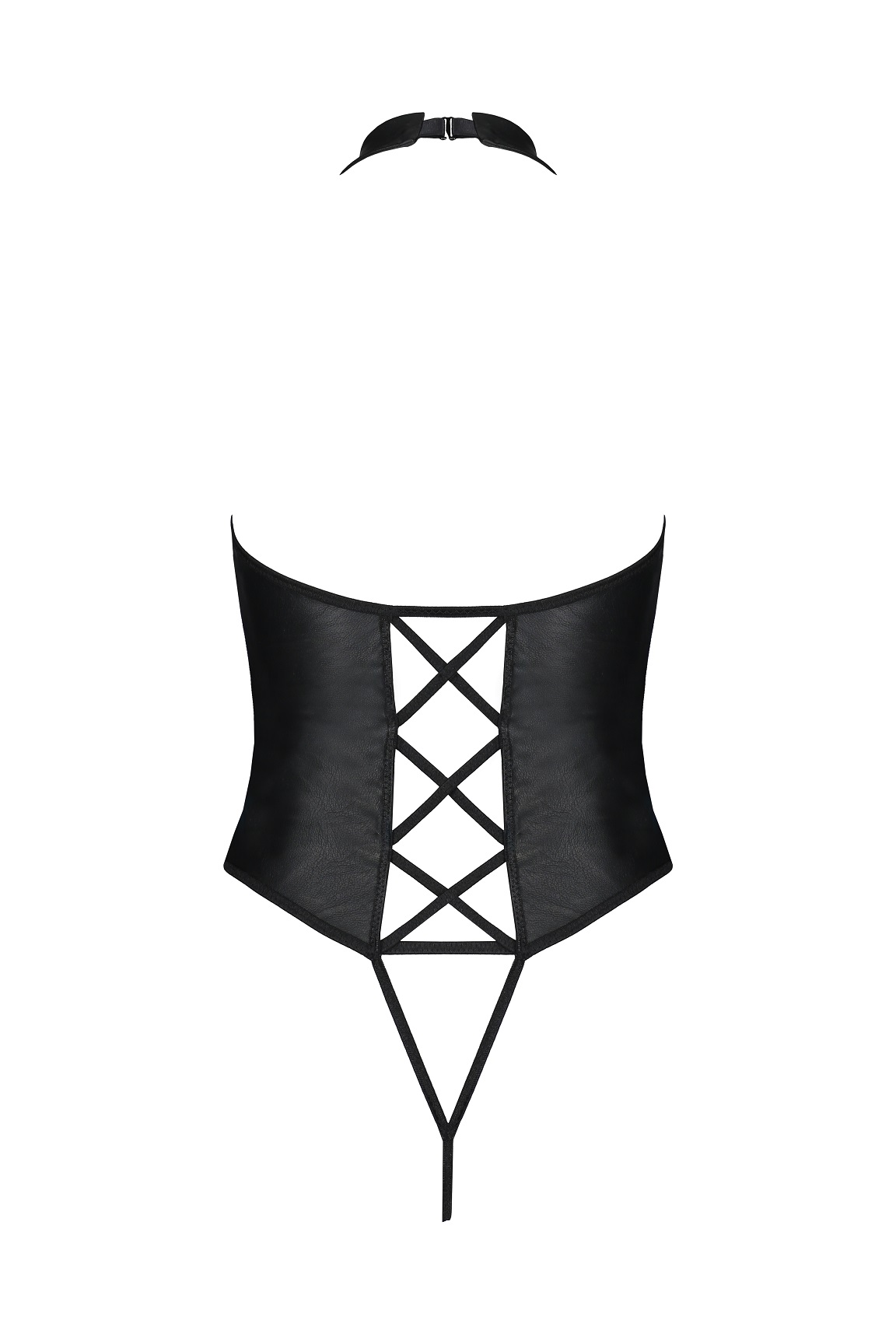 Sexy body nero con apertura sul décolleté decorata da stringhe a incrocio e apertura all'inguine.