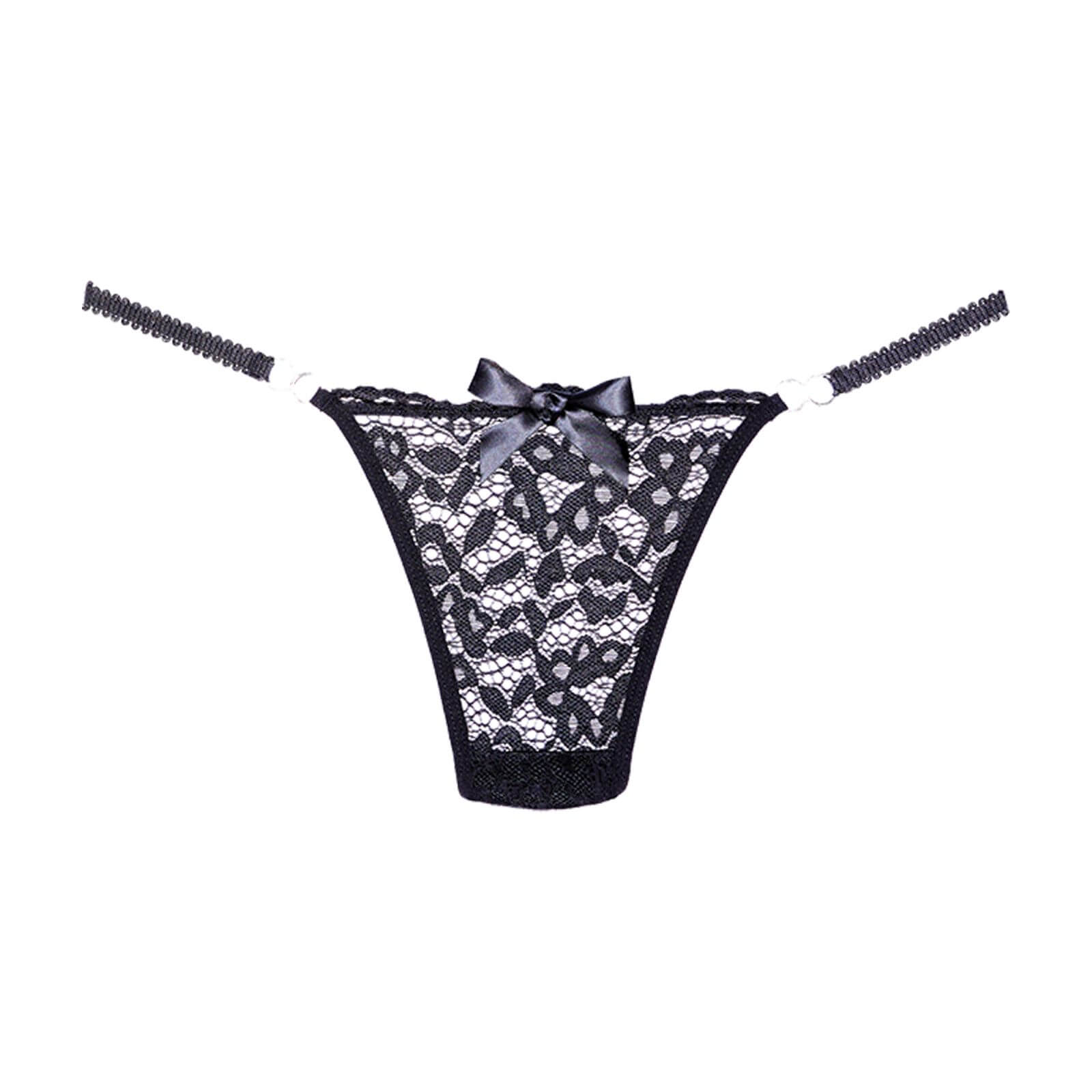 Perizoma in pizzo nero con fiocco frontale e anelli decorativi. Linee leggere, vestibilità confortevole e stile raffinato firmato Allure.