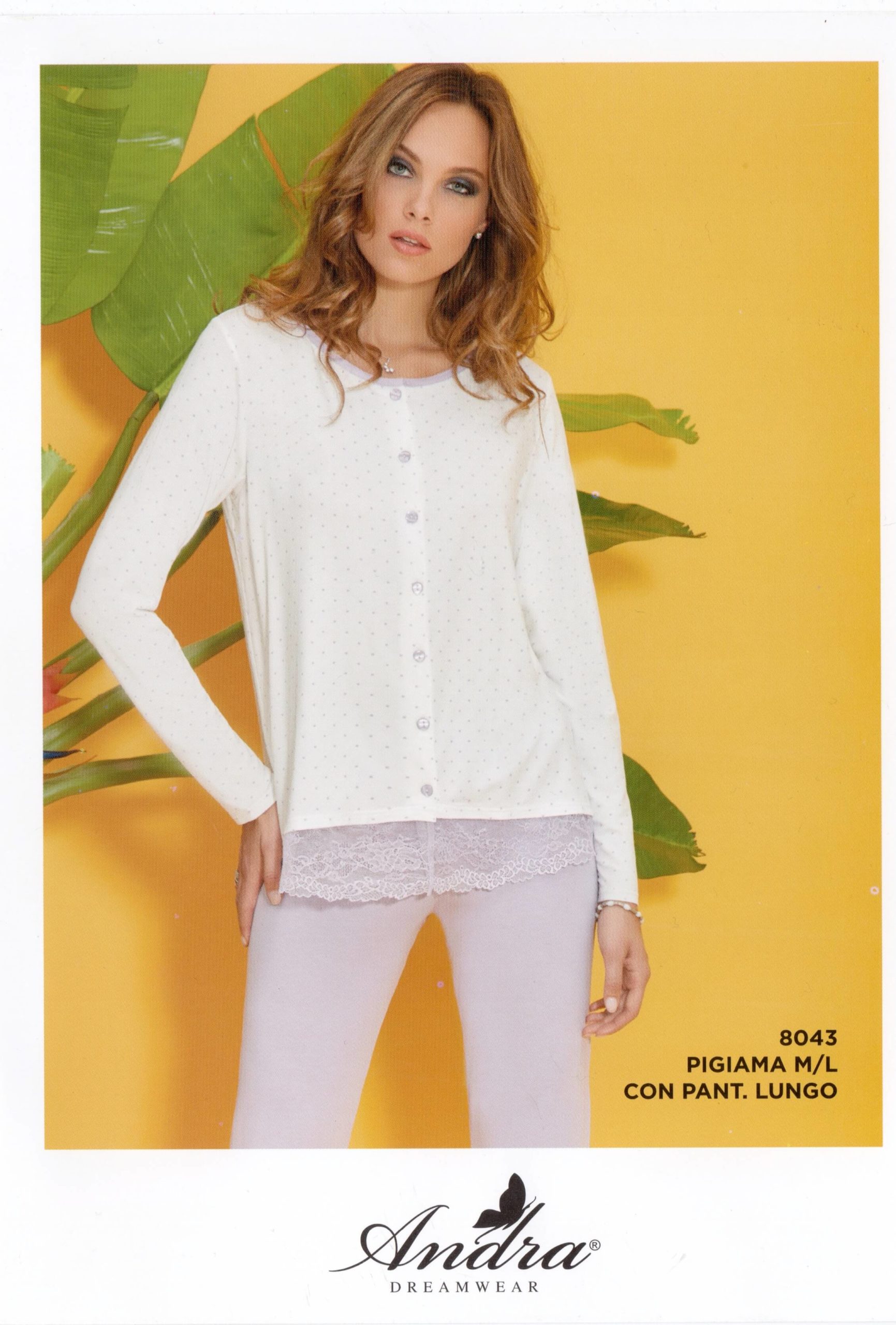 Pigiama donna Andra art.8043. In morbidissima e fresca viscosa con rifiniture e pois color lavanda, tutto abbottonato sul davanti con applicazioni in pizzo in contrasto. L’eleganza fatta pigiama! Nuova collezione!!