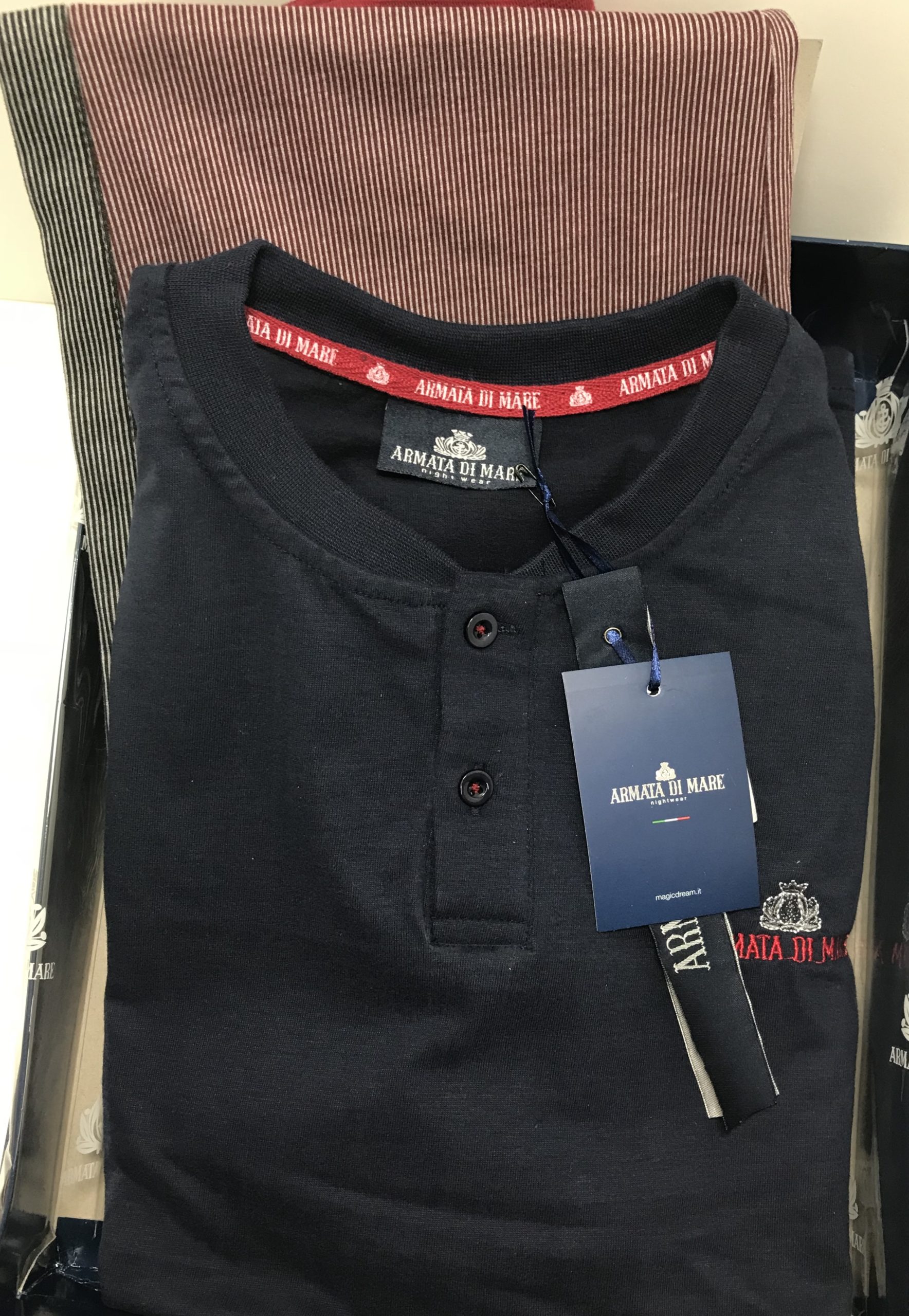 Pigiama uomo Armata di mare in caldo cotone. Manica completamente colorata con toppa e polsino. Particolare il pantalone, finemente gessato con banda laterale in contrasto, anch’esso con polsino. Composizione: Poliestere 70% – Cotone 30%
