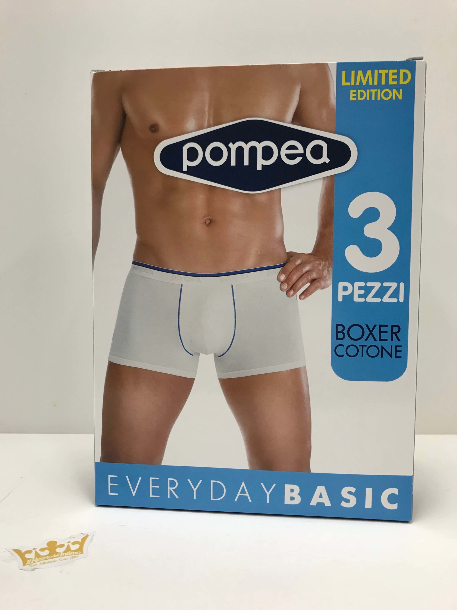 Pompea boxer uomo x3 in morbidissimo cotone ed elastico in vita. Edizione limitata disponibile in tre colori all’interno (blu/grigio/nero) Qualità e comodità garantita!! N.B. Nella taglia tg.5 è disponibile al momento solo il pacco tutto nero all’interno.