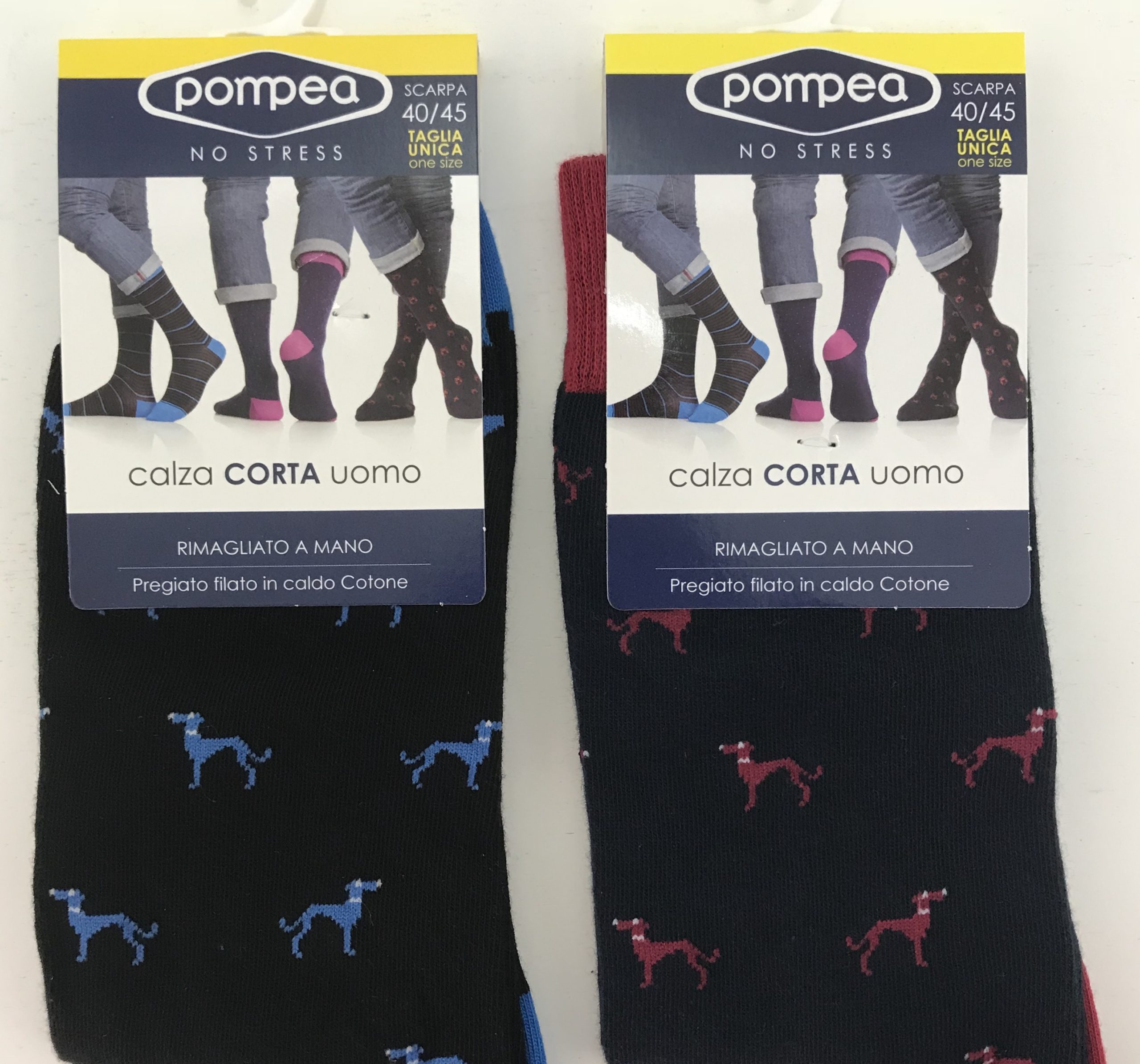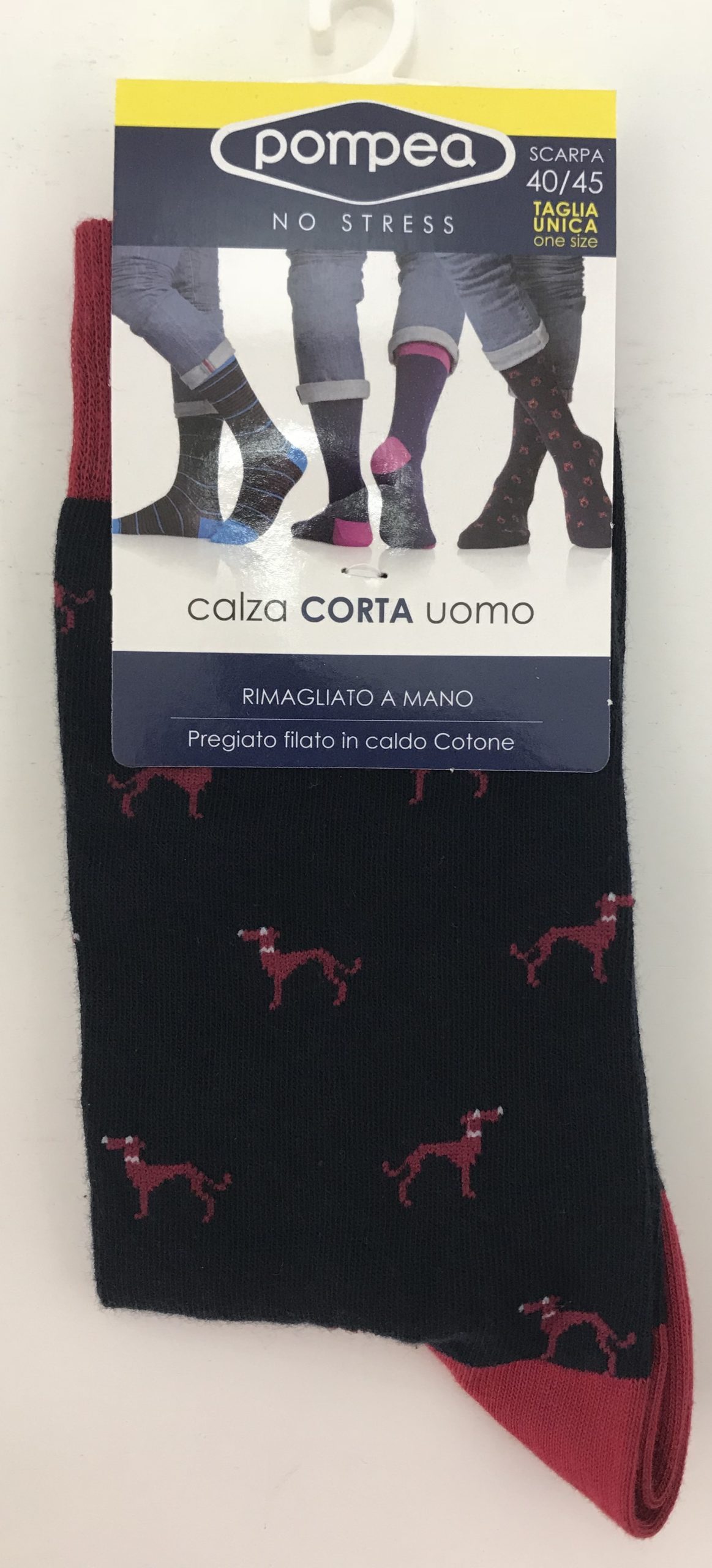 Pompea calza corta uomo, realizzato in pregiato filato in caldo cotone, rimagliato a mano. Disponibile nella fantasia “cane” rossa e blu.
