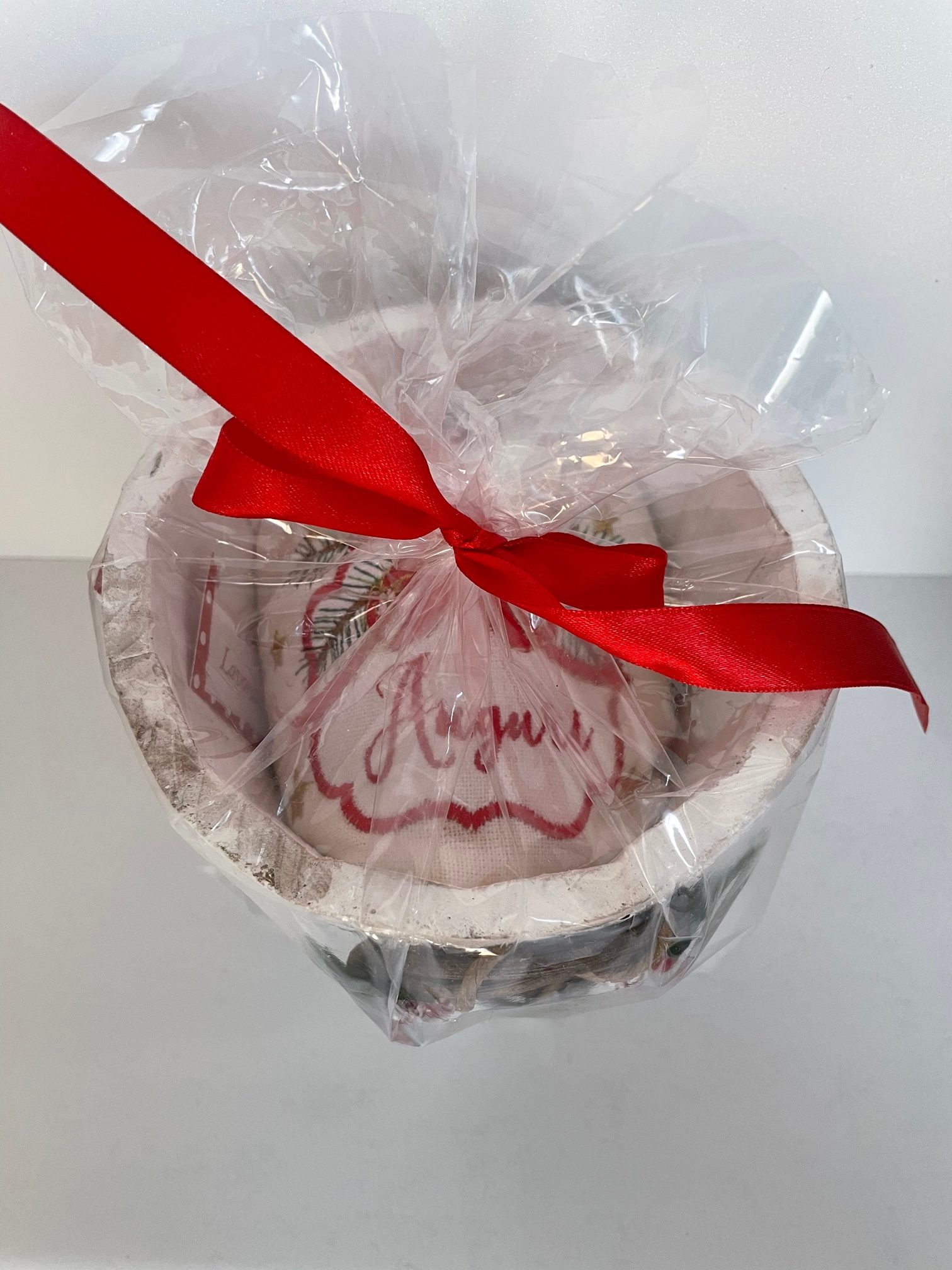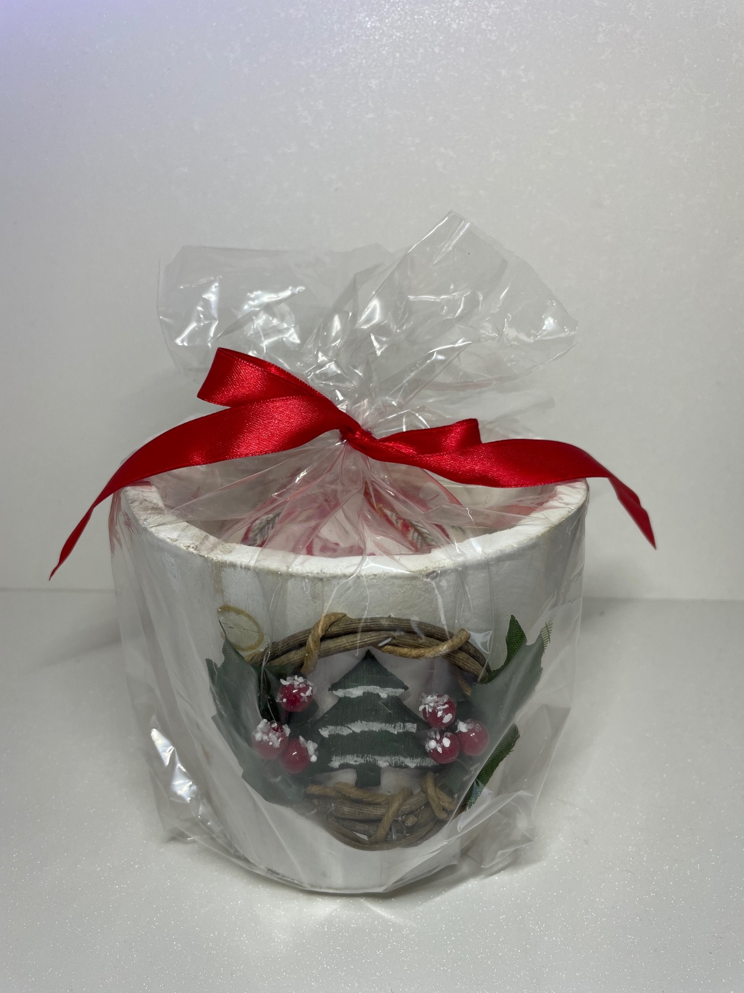 Preziosa vasetto decorativo in legno shabby con strofinaccio e presina con stampa natalizia. Ottimo come idea regalo!
