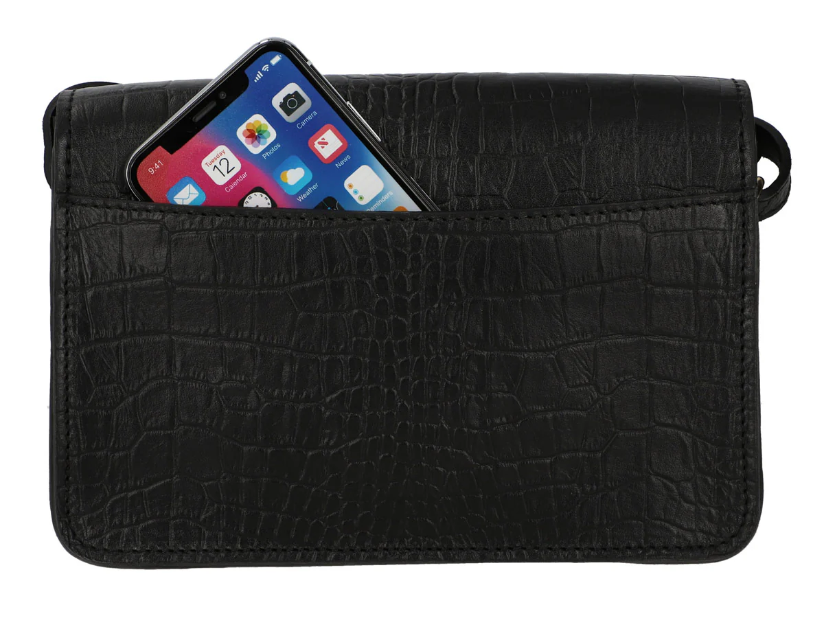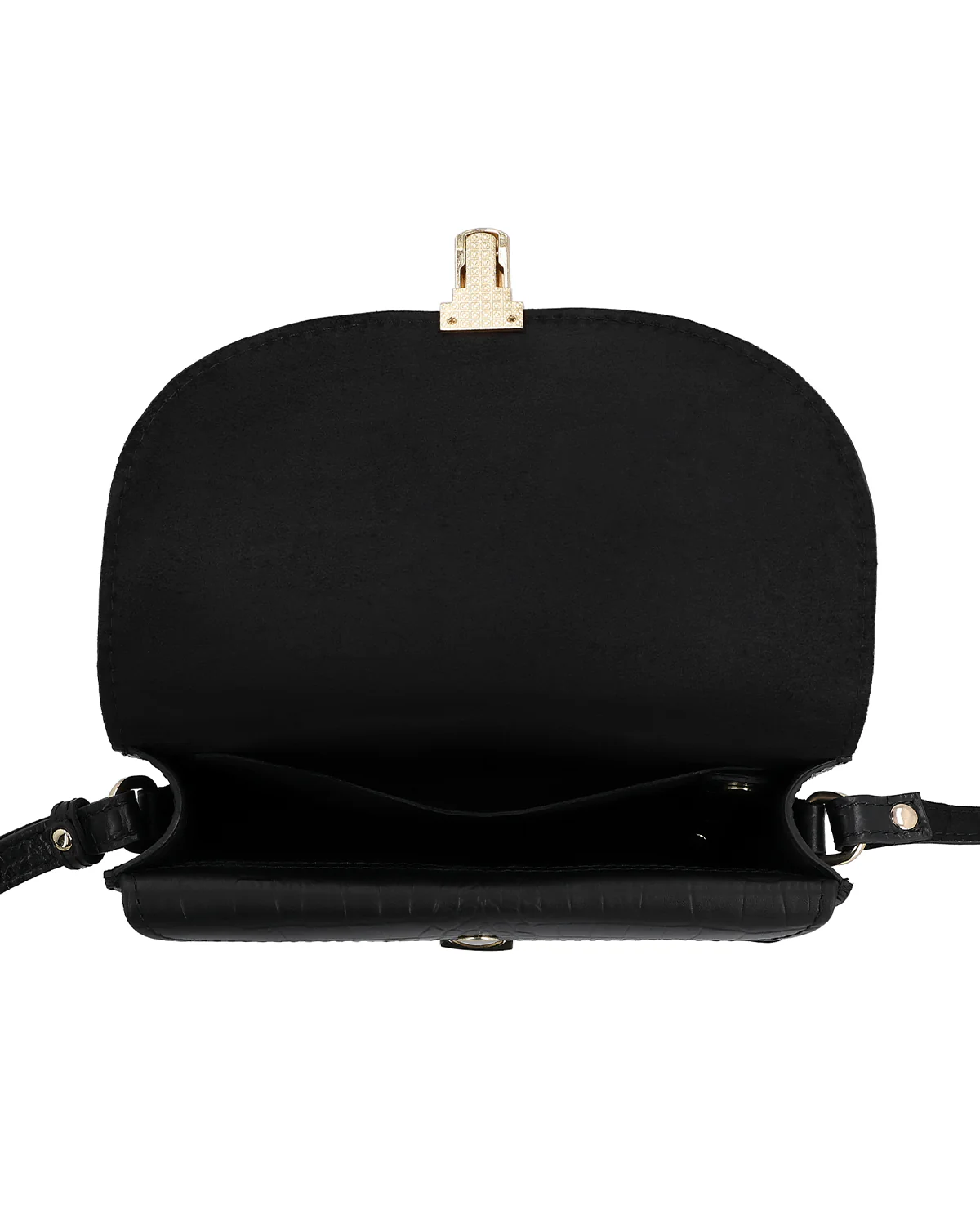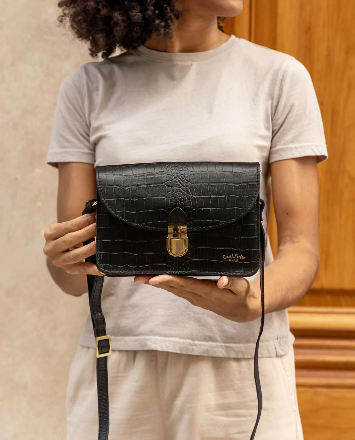 Cerchi la borsa a tracolla che trasforma la notte in giorno? Allo stesso modo valorizza ogni outfit nella vita quotidiana? Ecco „Sandy“ al salvataggio! La sua forma sottile la rende la borsa a tracolla ideale. L’aspetto coccodrillo si distingue discretamente dal cuoio nero della borsa e colpisce con stile grazie al suo tocco di colore sotto forma di applicazioni dorate discrete.