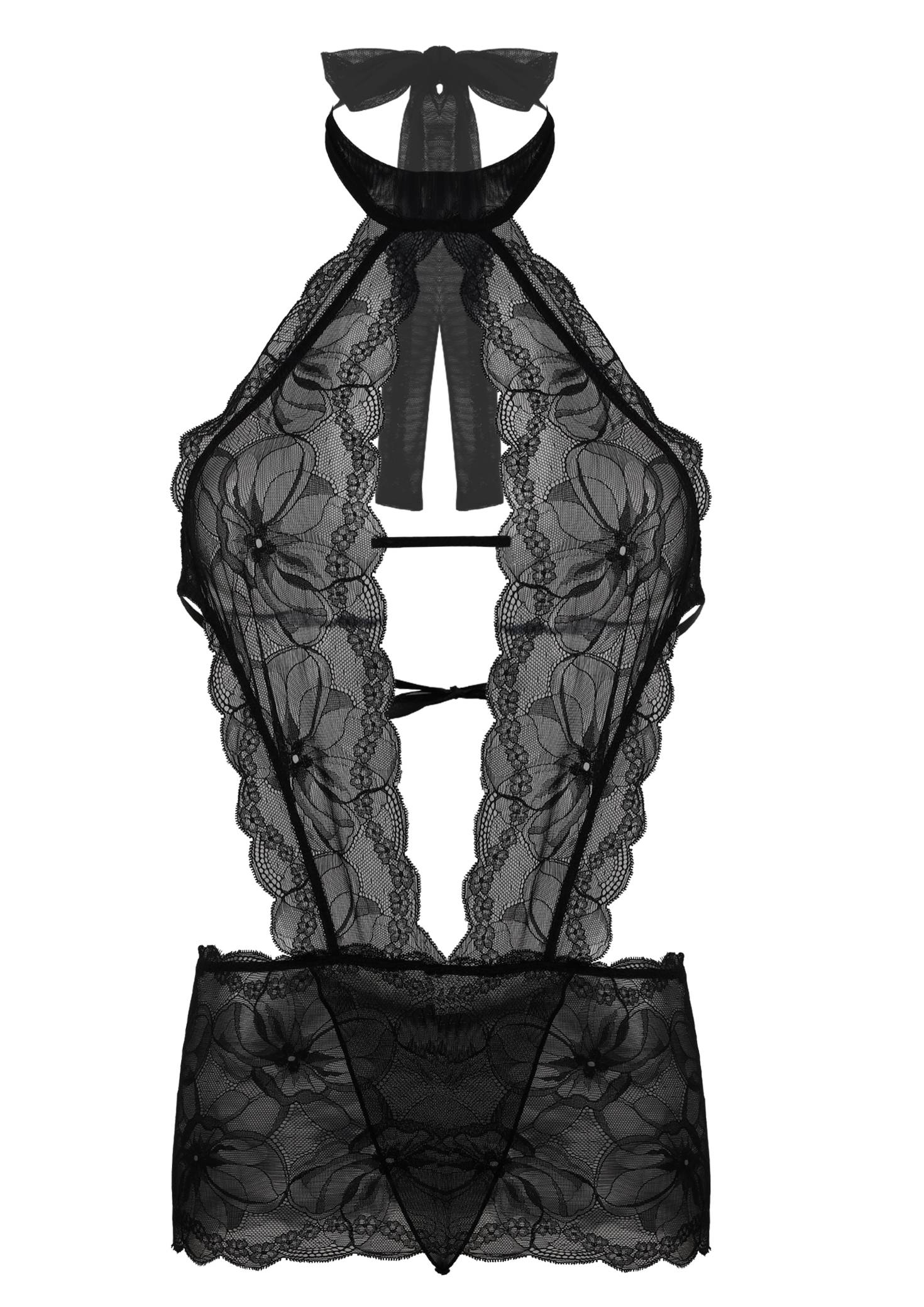 Un body ad altissimo contenuto erotico, in pizzo nero finemente decorato, con inserto effetto gonna sovrapposta integrata, fianchi scoperti, scollatura profonda, schiena nuda.