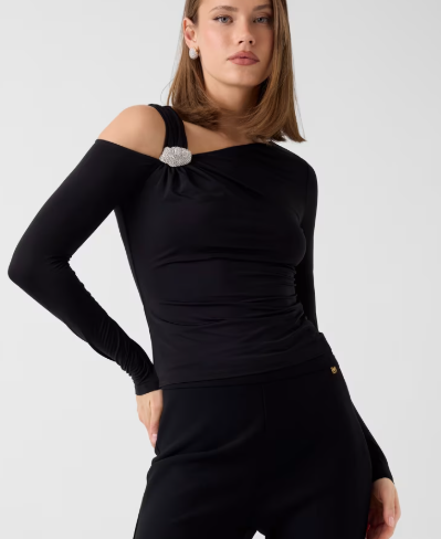 Top con manica lunga cut ot con dettaglio in strass Marciano donna. Top in maglia a maniche lunghe con dettaglio cut ot su una manica e nodo in strass dall’altra