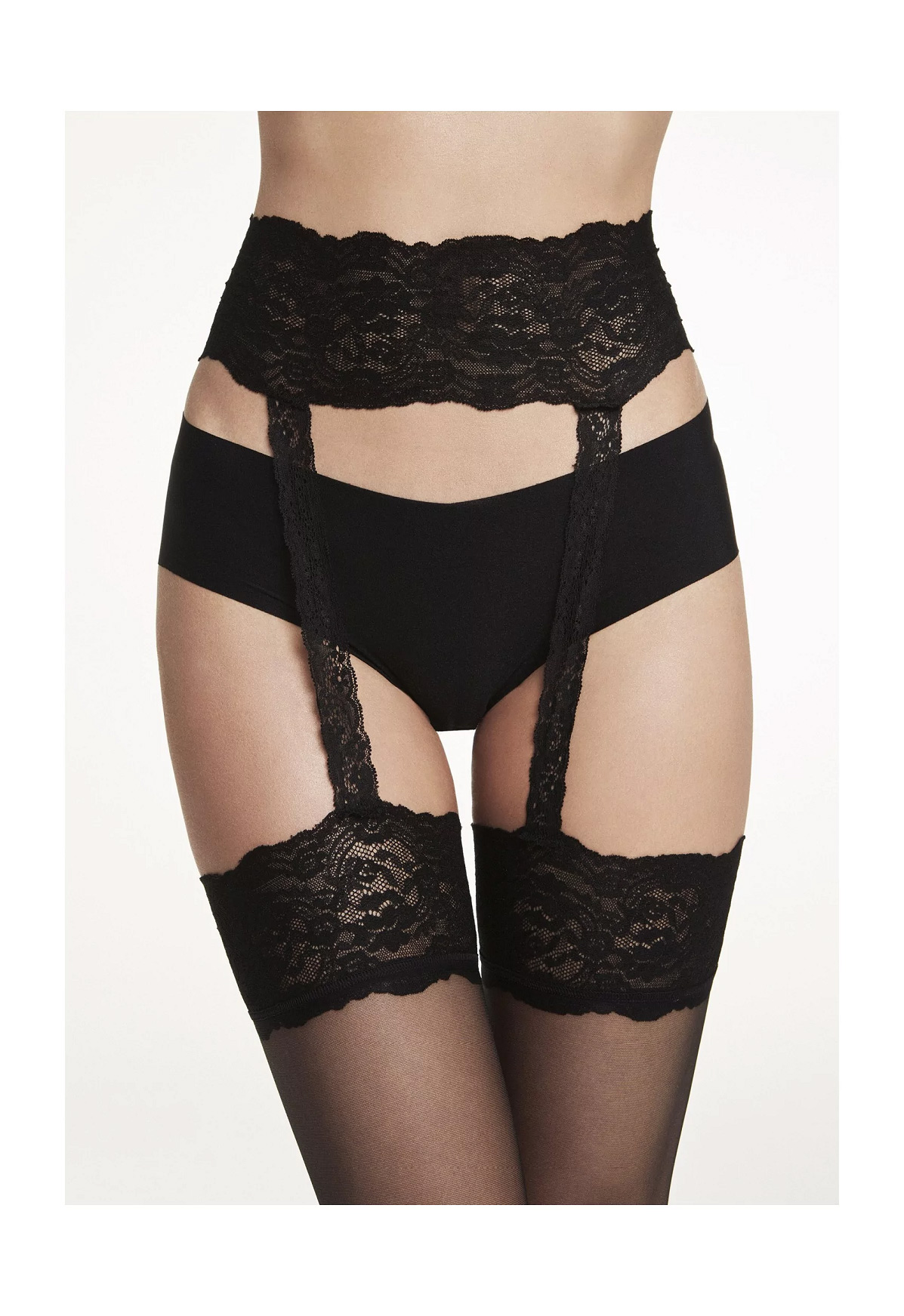 Cinturino, stringhe e balza in elegante pizzo nero.